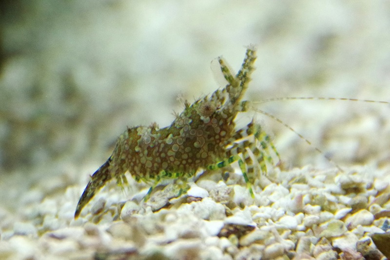 普段はサンゴ岩の陰に隠れているフシウデサンゴモエビ。地味な色合いなので気づく人は少ないようです。部屋を暗くする夜間バージョンの時に出てきますよ。