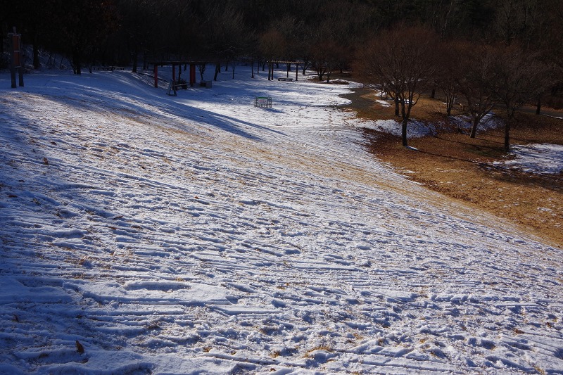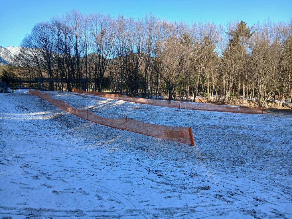 こちらは河畔の広場の斜面。薄く残った雪の上には、たくさんのソリの跡がありました。例年雪の多い大町・松川地区をご案内していますが、今日現在大町・松川地区でも雪がほとんど無いようです。芝生が出ている条件でのソリ遊びは十分気を付けてくださいね。