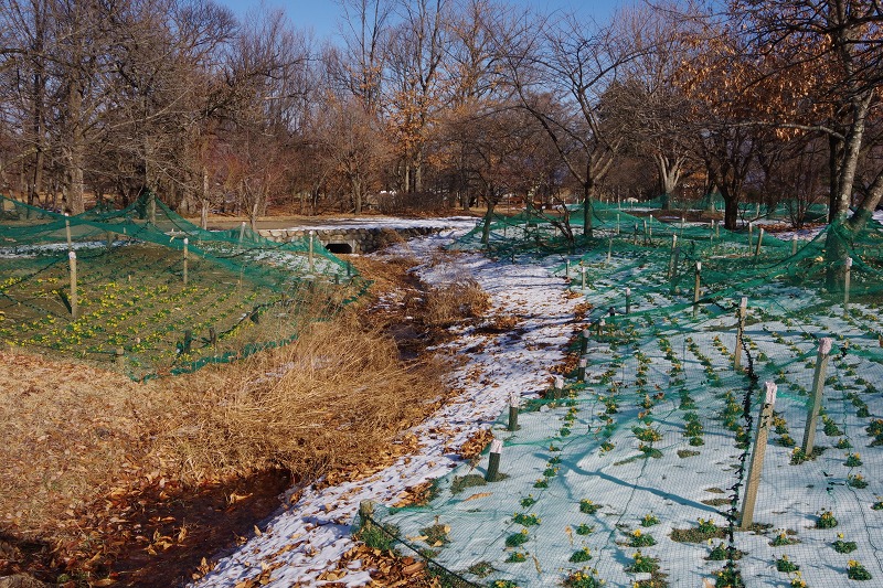 段々原っぱと野原の間を流れる小川の両岸には、ビオラが植えられています。斜面の僅かな傾きで、日当たりの具合が違って来るようです。