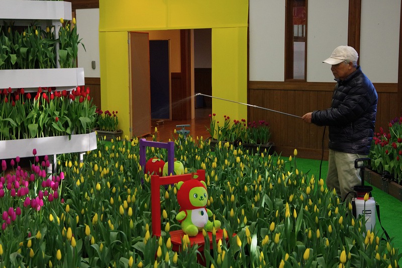 今日は休園日です。朝の最低気温は氷点下10℃位まで下がりました。そんな寒い中でも咲いているのが、あづみの学校多目的ホールのアイスチューリップです。