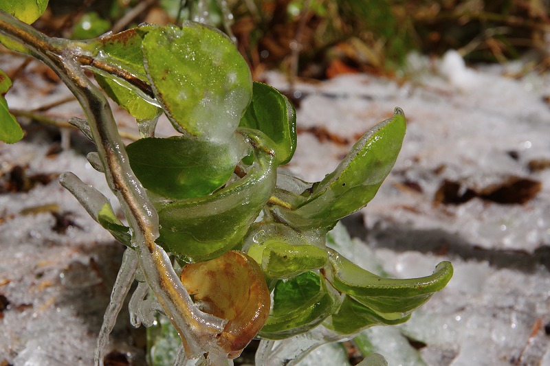さらにその下にあるツバキの葉も氷漬けになっていました。数日は溶けては凍るのを繰り返しますよ。ちょっと高価な和菓子のようにも見える?