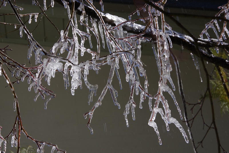 あづみの学校の屋根の積もった雪がとけ始めると、水滴が落ちて軒下の木の枝に張り付きます。夜の間に凍って枝全体がコーティングされています。
