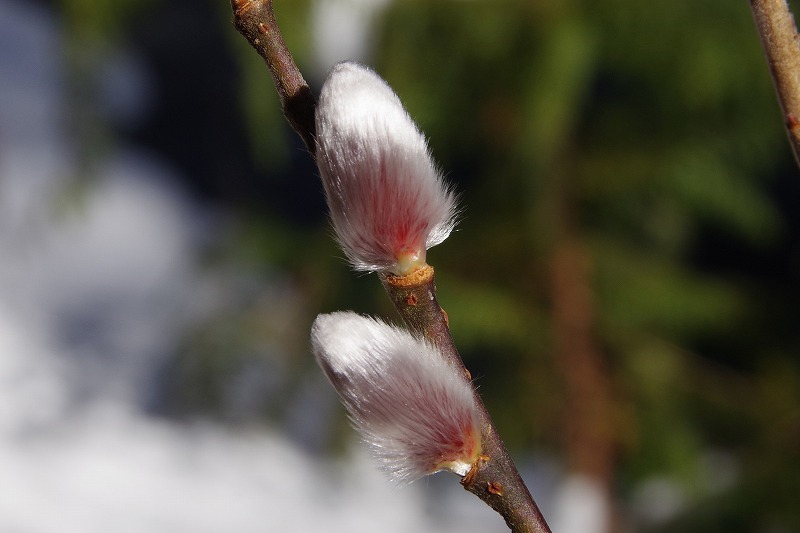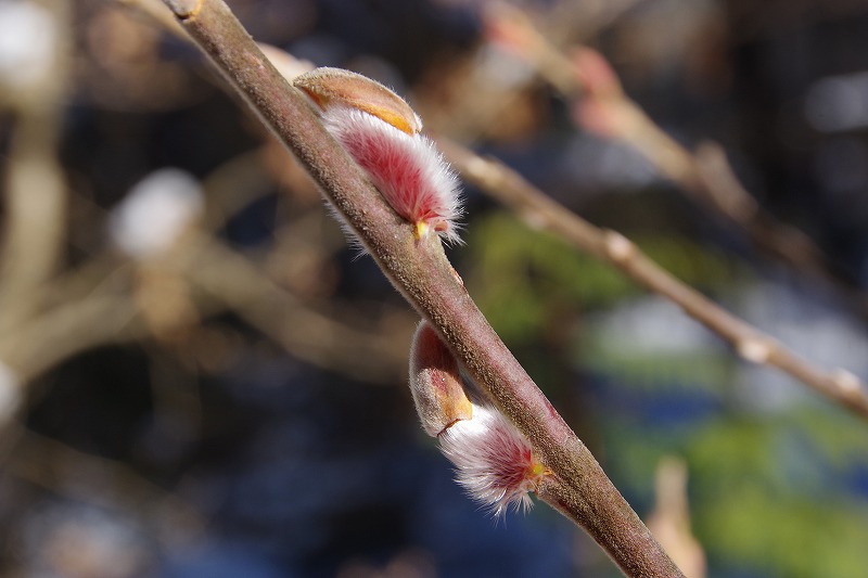 アイスチューリップに負けじと顔を出したのが、芸術教室横を流れる小川沿いのピンクネコヤナギ。冬芽の芽鱗を脱いでフワフワの絹毛が現れています。