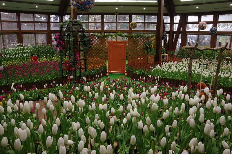 会場入り口の方向。上からぶら下がる、くす玉のような球形の造花が可愛らしいですね。3段に積み上げたチューリップの塔も見下ろしますよ。