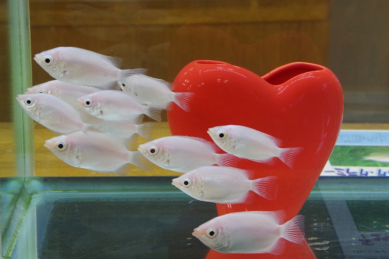 あづみの学校理科教室の特別展示『チュッチュするお魚 キッシング・グラミー』。2つの水槽のうち大きな水槽のお魚たちは、ハートの前で仲良く整列です。