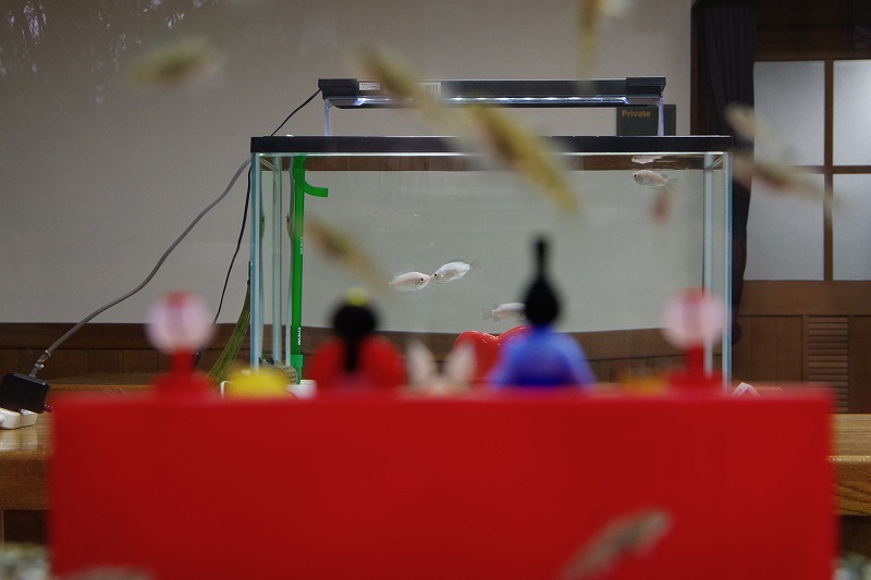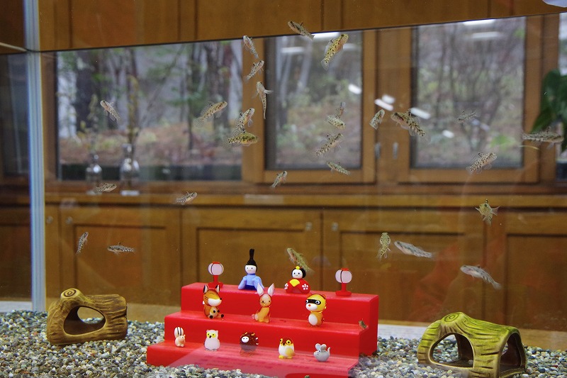 3月3日は桃の節句、ひな祭りです。あづみの学校の理科教室では、ヒナハゼたちが今日の主役。水槽の中ではガラス細工の「水中ひな飾り」との共演です。