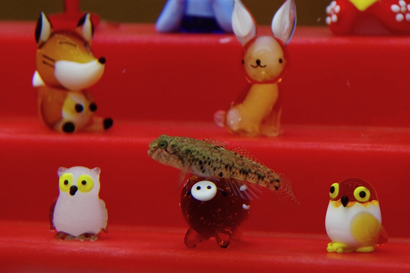 ガラスのイノシシの上で休憩中。時々ひな壇に上がり、ひな人形の仲間入りをすることもあります。ヒナハゼの名前にふさわしいショットですね。