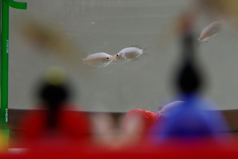 お内裏様の視線の先にはキッシング・グラミーの水槽。チュッチュする様子を見ていますよ。展示期間は今日までですが、8日の日曜日まで置いておきますよ。