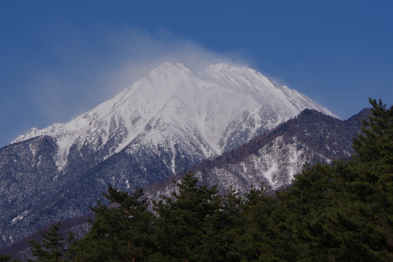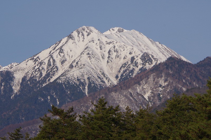 常念岳山頂付近は4日前に降った雪で、少し冬に逆戻りです。雲が残っているのか、風で雪が巻き上げているのか、白く霞んでいました。
