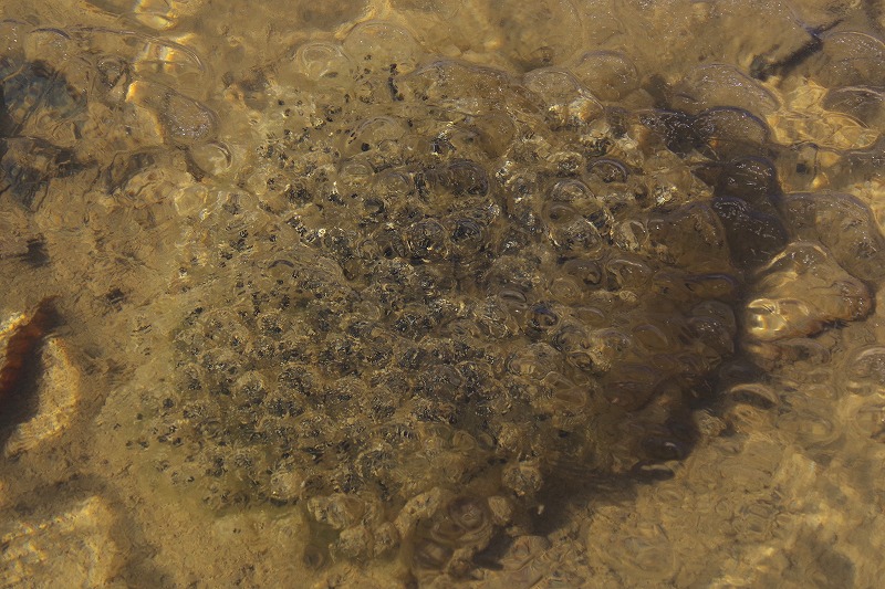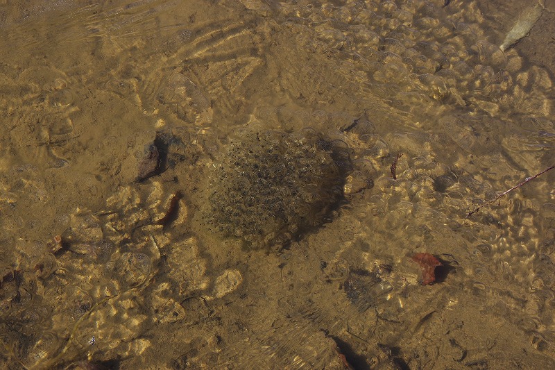冷え込みの影響で薄氷が張った池を覗くと、なんとヤマアカガエルの卵がありました。数日前には無かったので、昨夜か一昨日の夜に産んだようです。