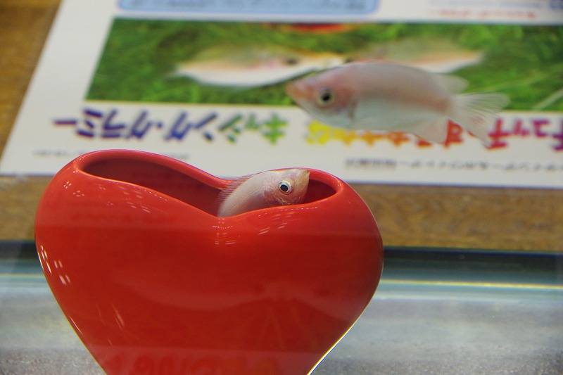 小さな水槽の方ではハートのポットに入る個体。少し瘦せいていてチュッチュにも参加しません。他の個体からいじめられないように隠れているようです。