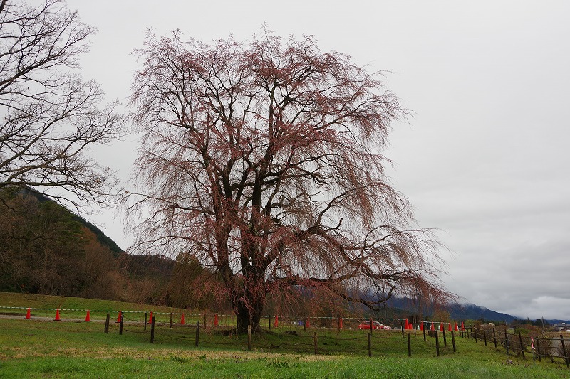 里山文化ゾーンの堀金口南側、第5駐車場の一角にあるのは「大しだれ桜」。今朝見に行くとちらほらと開花していました。暖かいので早く咲き進みそうです。