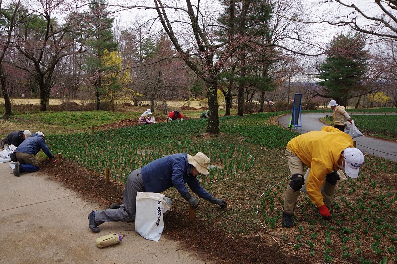 久しぶりの登場は、植物管理でお馴染みの〝シルバーズ〟の皆さん。お休みだった冬の間にエネルギーを蓄えて活動再開です。最初の作業はチューリップ畑の落ち葉取りと雑草取り。今年も12月までよろしくお願いします。