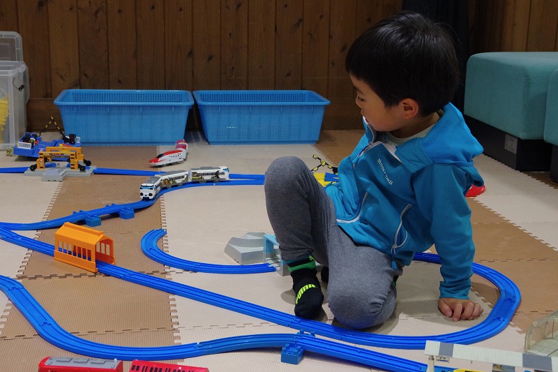 玄関ホールの『ちびっ子あそび広場』も明日で終了です。おたまくんはこちらでも大好きなプラレールで遊んでくれました。