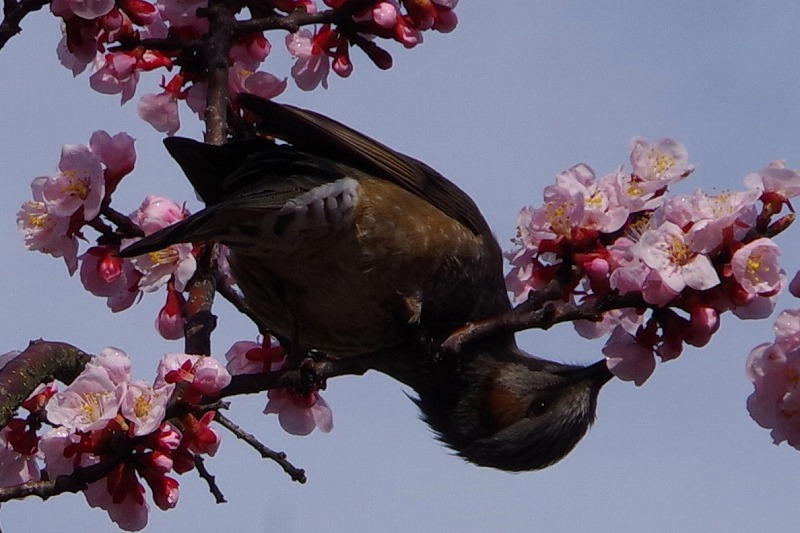お気に入りはハナモモです。蜜を吸うだけでなく花を食べたり落としたりもするので、ヒヨドリがいた後は地面に花びらが散らばっているのです。