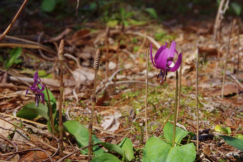下から2段目のカタクリは可愛らしいツクシとの共演。ツクシはスギナの胞子茎で、胞子を飛ばしたら枯れてしまいます。入れ替わるように光合成をする栄養茎のスギナが生えてくるそうです。ツクシはスギナにはならないのです。