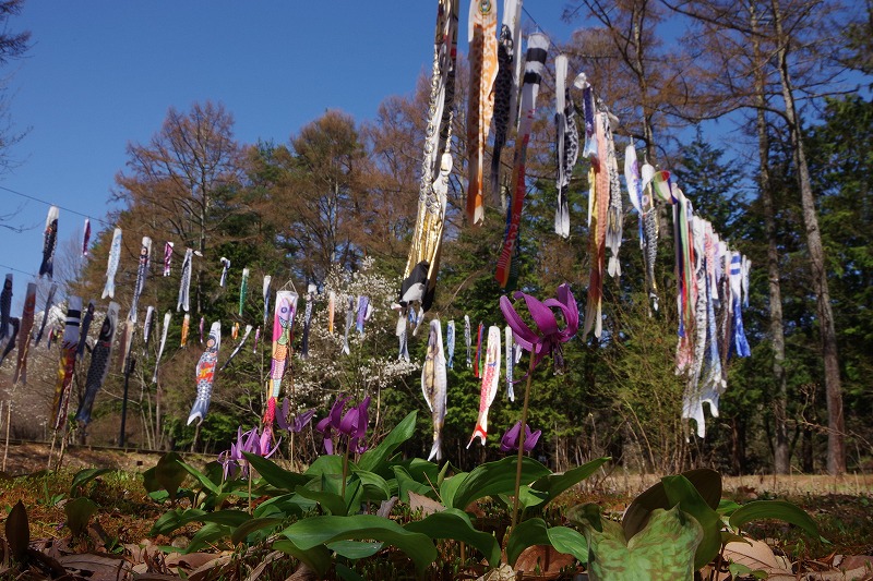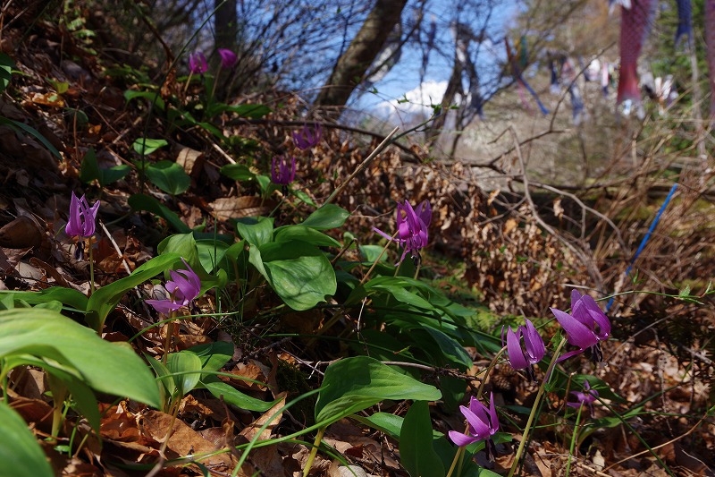 段々花畑ではカタクリの花が見頃になっています。花畑の下から3段目にまとまって咲いていたカタクリと、安曇野の空を泳ぐ「鯉のぼり」との共演です。