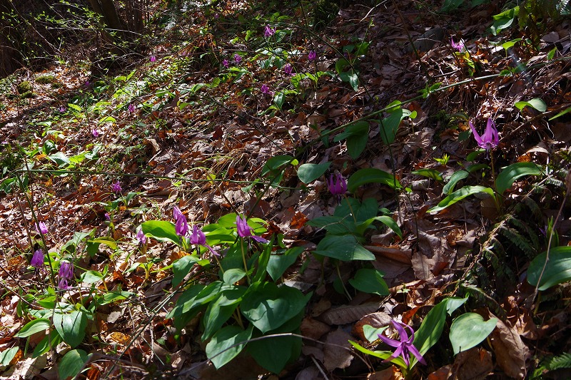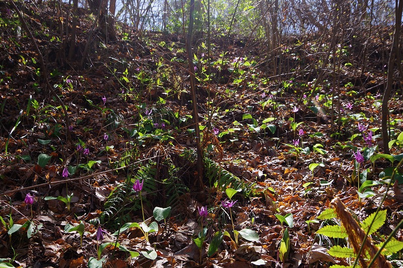 花畑の南側斜面でもカタクリが見頃です。カタクリの種から花を咲かせるまでは7~8年かかります。何年もかけて斜面いっぱいに広がっていきましたよ。