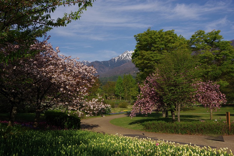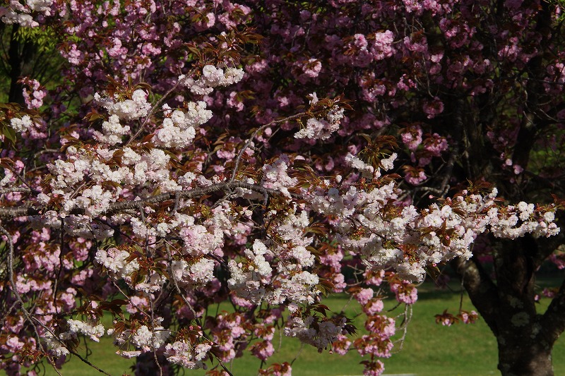 アンティークな色調のフゲンゾウ(普賢象)と濃いピンクのカンザン(関山)の共演。これにチューリップが加わると、あづみの公園ならではの風景ですね。