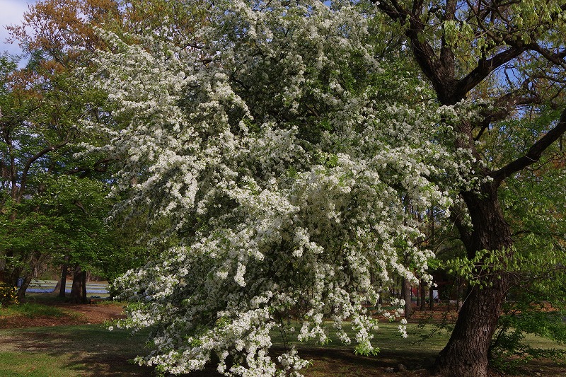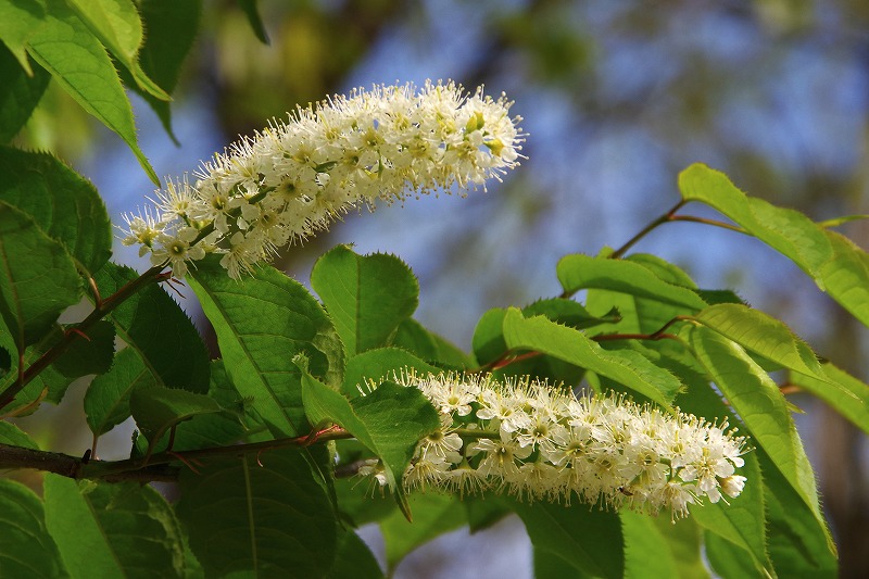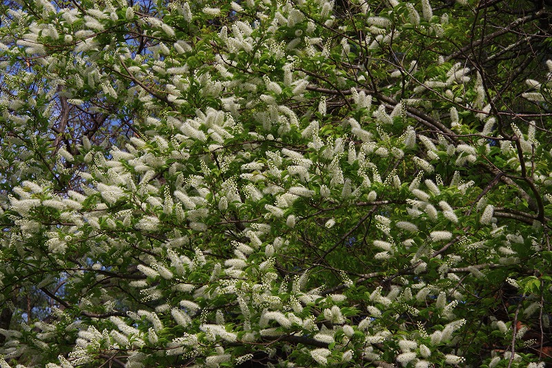小さい花が集まったブラシのような花序が特徴のウワミズザクラ。八重桜と共に、公園の桜の開花リレーの終盤を飾ります。桜っぽくないですね。