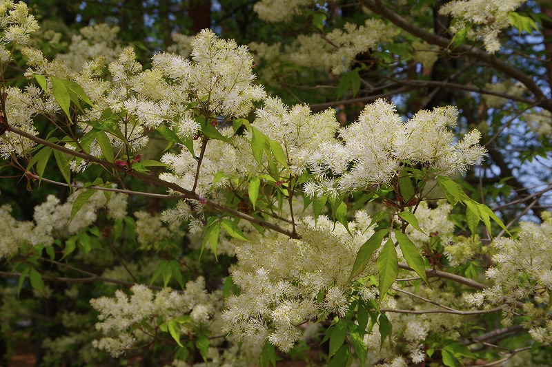 白い花が続きます。こちらはマルバアオダモ。他のアオダモの葉に比べ鋸歯がないことから丸葉の名前ですが、細長い葉の形をしていますよ。
