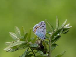 オオルリシジミは、瑠璃色の翅がきれいな大型のシジミチョウです。1年に一度だけ成虫が出現するチョウで、5月中旬~6月中旬に成虫が現れ産卵します。約1週間後には孵化して幼虫となり、7月から蛹として約10カ月を過ごします。幼虫はマメ科のクララという植物の蕾と花しか食べません。