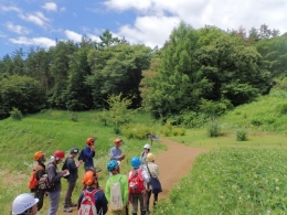 新しいビオトープにどんな生きものが来ているか自然観察を行います。また、ビオトープの様子を見ながら、もっと来そうな生き物のために草取りなどの手入れを行います。
