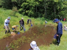 里山文化ゾーンには、ゲンゴロウたちの棲むビオトープ池があります。ゲンゴロウたちの棲み家を維持するため草取りなど手入れ作業をします。ゲンゴロウたちがいるか確かめるため、網を使って探してみましょう。