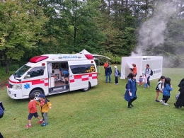 災害時に活躍する車や、救急車を展示します。火災時の煙体験も。