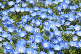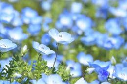 ネモフィラは北アメリカ原産の一年草で、澄んだ瑠璃色の花を咲かせます。葉が唐草模様に似ていることから、和名では「瑠璃唐草(るりからくさ)」と呼ばれています。また、白い中心をもつ小さな青い花姿から、英語では「Baby blue eyes」の名でも親しまれています。なお、「ネモフィラ」という名前は、ギリシャ語の「ネモス(小さな森)」と「フィレオ(愛する)」に由来しています。