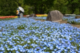 「れき原の花畑」では、今年度ネモフィラを植栽し、花畑を一面青色に刷新しました。昨年度はチューリップとの組み合わせをお楽しみいただきましたが、本年度はネモフィラ一色の景観をご覧いただけます。あわせて花畑も拡張し、面積は1,500m2・約4万株から2,500m2・約6.3万株へと大幅にスケールアップしました。青一色に広がるネモフィラと、乳川扇状地特有のれき(石)が織りなす風景は、当公園ならではの魅力です。